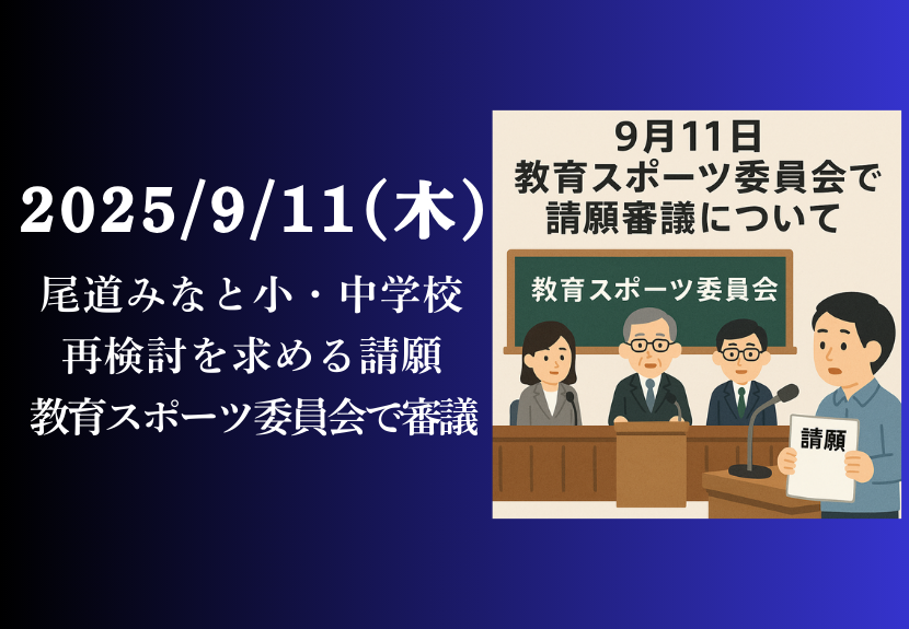 2025年8月29日(金)、村上正臣氏(税理士)・上家和子氏により、尾道市議会へ「尾道みなと小・中学校新築事業の一旦中断・再検討」を求める請願が提出されました。 2025年9月11日(木)に開催される尾道市議会「教育スポーツ委員会」において、当件が審議されます。 この請願は、 提出者:村上正臣氏(税理士)・...