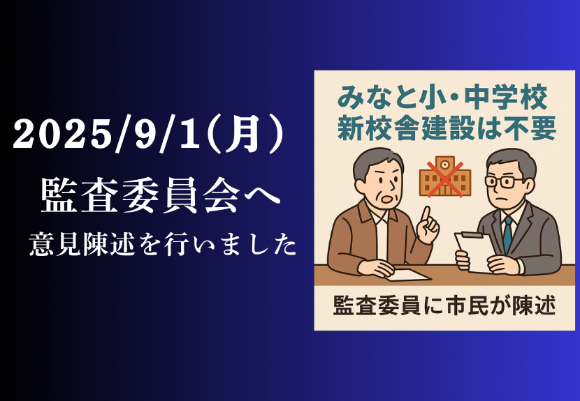 2025年8月19日(火曜) 本日10:45、「尾道の未来を考える会」代表 福島光宏らは、代理人の山田延廣弁護士、工藤勇行弁護士とともに、尾道市監査委員会に、尾道みなと小学校及び尾道みなと中学校の新築工事についての住民監査請求書を提出しました。 この監査請求には、1,780名余の方のご賛同を得ました。 監査...