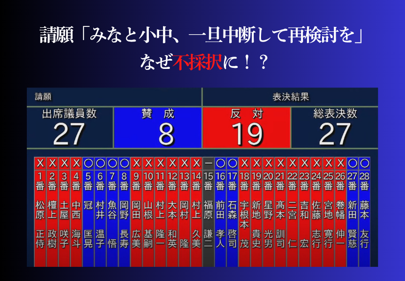 尾道みなと小・中 急激な少子化を踏まえ一旦中断再検討をという請願、委員会では理由なく不採択